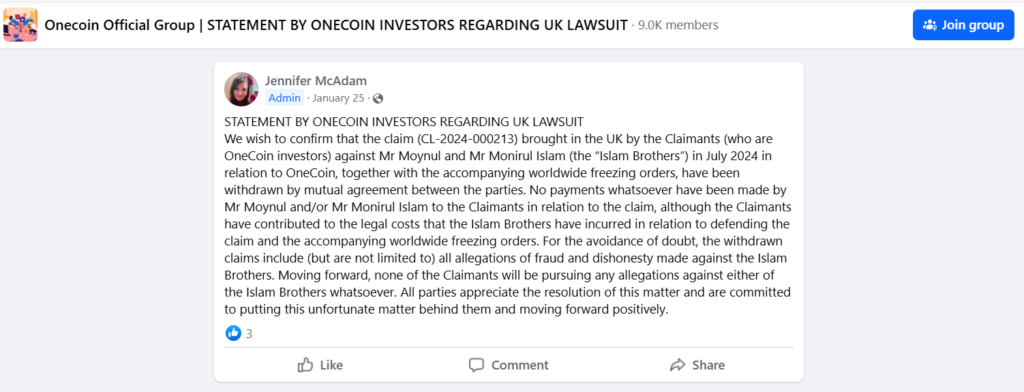 In July 2024, a group of investors of the OneCoin scheme filed a claim in the UK High Court against key OneCoin figures, which included the Islam brothers.